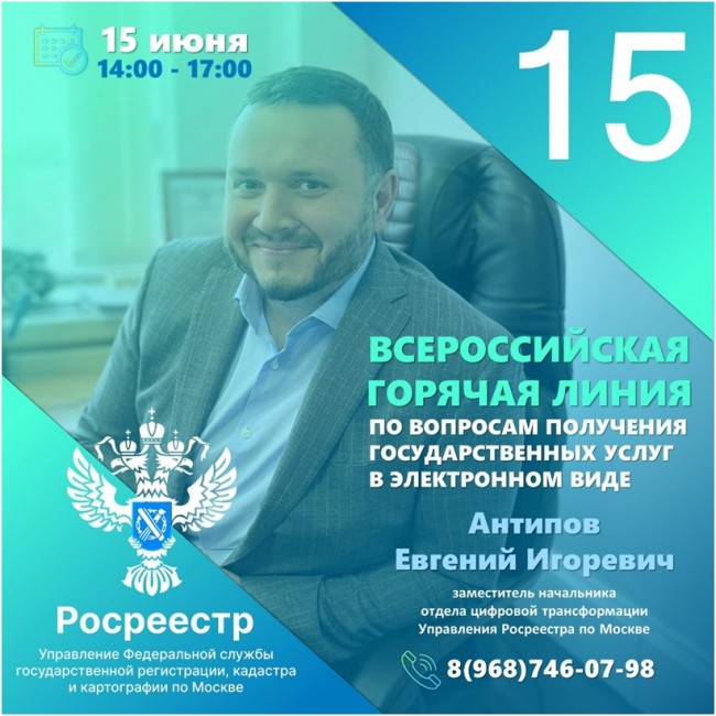 Управление Росреестра по Москве информирует, что 15 июня 2023 года с 14:00 до 17:00 по московскому времени состоится телефонное консультирование граждан в рамках Всероссийской горячей линии, приуроченной к 15-летию ведомства.