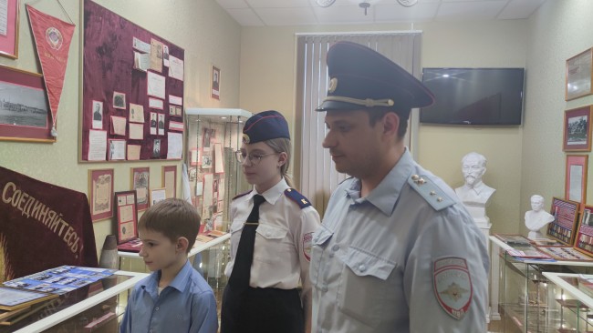 Экскурсия для 12-летней Дианы, ученицы кадетского класса лицея Обнинска, и 7-летнего Сергея, началась с экскурсии в Музей отдела. Ребятам рассказали об истории создания подразделения, о транспортной полиции и особенностях несения службы. Гости внимательно изучили экспонаты времен Великой Отечественной войны, заинтересовались мемориалом, посвященным сотрудникам, погибших при выполнении служебных обязанностей.