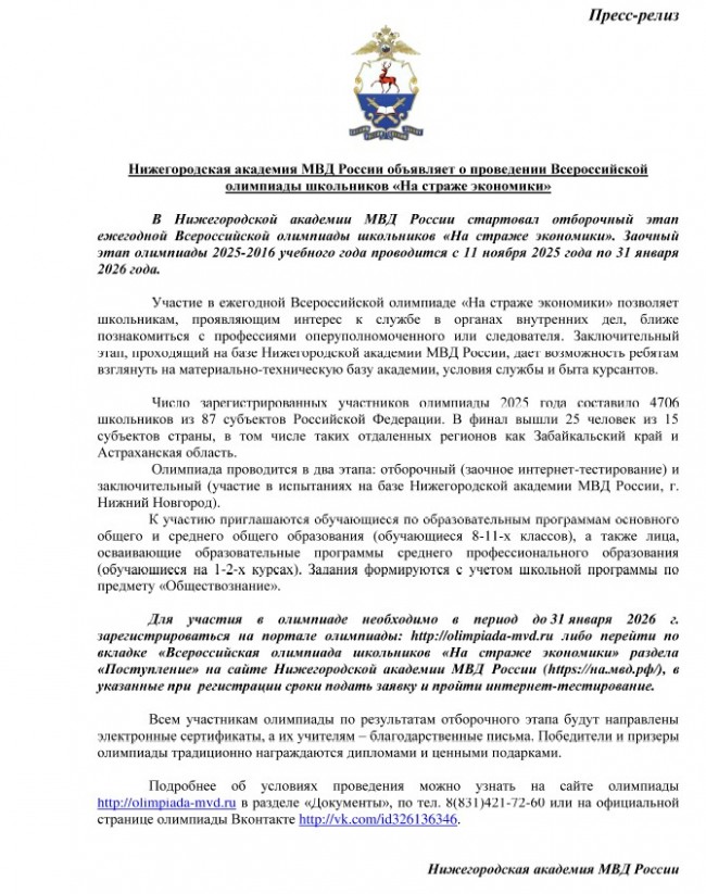 В целях ранней профессиональной ориентации граждан на службу в органы внутренних дел и отбора потенциальных кандидатов на обучение в образовательные организации системы МВД России, ФГКОУ ВО «Нижегородская академия МВД России» организует проведение Всероссийской олимпиады школьников «На страже экономики».