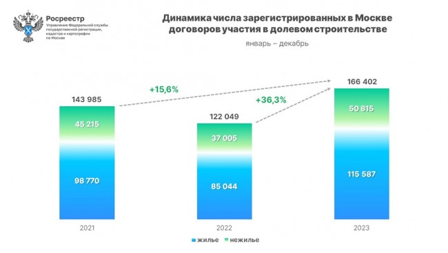 Всего в январе-декабре 2023 года в Москве зарегистрировано 166 402 ДДУ в отношении жилой и нежилой недвижимости. Данный показатель увеличился на 36,3% к 2022 году (122 049 ДДУ) и на 15,6% к аналогичному периоду 2021 года (143 985 ДДУ).