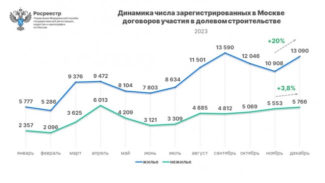 В декабре 2023 года Управлением Росреестра по Москве зарегистрировано 18 856 договоров долевого участия в строительстве в отношении жилой и нежилой недвижимости, что на 14,6% больше результата ноября (16 461 ДДУ). По отношению к декабрю 2022 года (12 176 ДДУ) данный показатель увеличился на 54,9%, а по сравнению с аналогичным периодом 2021 года (15 737 ДДУ) рост составил 19,8%.
