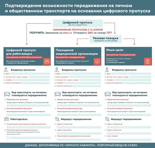 «Получение цифрового пропуска требуется для поездок на любом виде личного и общественного транспорта – мотоцикле, скутере, автомобиле, такси, метро, МЦК, МЦД, пригородном железнодорожном и наземном общественном транспорте. Пропускная система носит заявительный характер. Получить цифровой пропуск сможет каждый, а перечень уважительных причин для поездок является открытым. Но городские власти оставляют за собой право проверить достоверность сообщаемых сведений. Проверять будем через соответствующие информационные системы и с помощью непосредственного контроля на дорогах и в общественном транспорте», - рассказал Собянин.