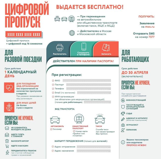Цифровой пропуск можно получать по смс на короткий номер 7377, по телефону +7 (495) 777-77-77 и на сайте mos.ru: