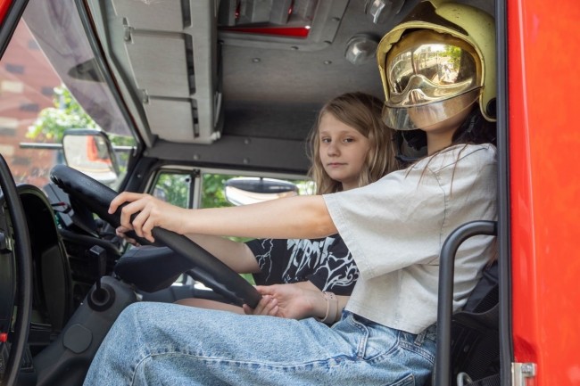 Маленькие пациенты больницы изучили оборудование пожарной автоцистерны и даже посидели за рулём машины.