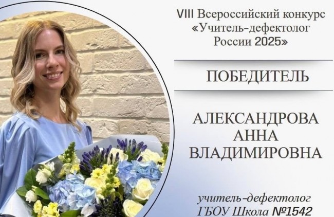 Педагог школы №1542 Анна Александрова заняла первое место в VIII Всероссийском конкурсе профессионального мастерства «Учитель-дефектолог — 2025».